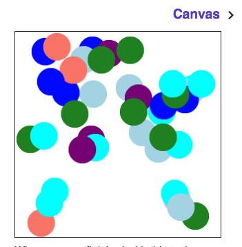 For this week’s section project was to work on using a new library called Canvas, where we can create a “canvas” and draw on it. The goal was to draw 40 random circles, with different colors and different locations.